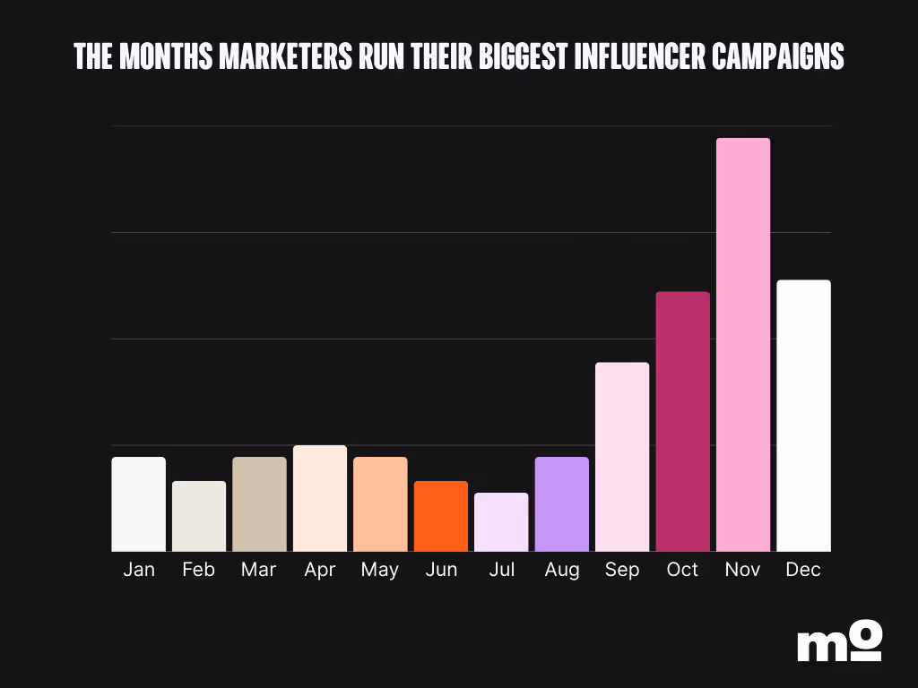 For most ecommerce marketers, Q4 is the busiest time of the year. In our survey, most marketers ran their biggest influencer campaigns in November, December, October, and September, in that order.